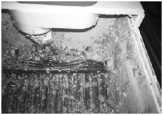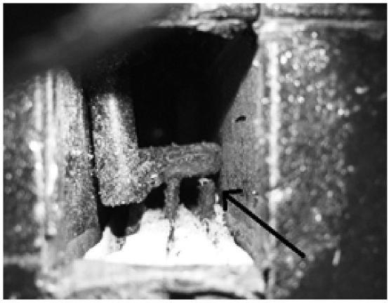 汇流排与极板的连接处称为极耳,如果发生严重扭曲或者断裂,将造成电池极极板脱落。当蓄电池内部极耳断裂时,电池内部并联的正、负极板数目会减少,另外,极化电容C2也会随之减小,造成电池的失容现象。极化电容C2值的变化对于蓄电池内部极耳断路的诊断和预防具有重要的参考意义。下图是一组汇流排断裂的照片。
