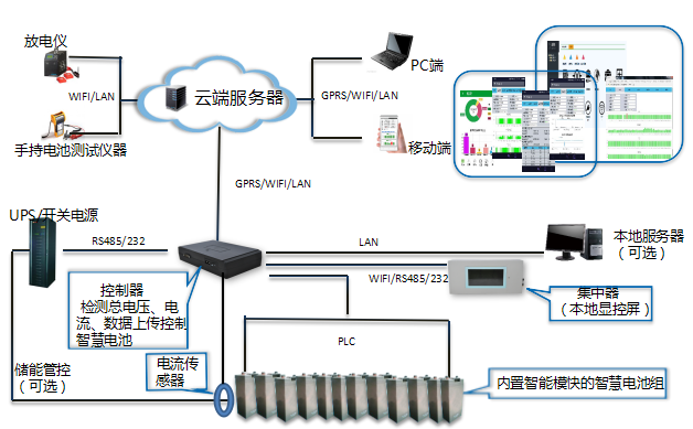 智慧电池云管理系统将智能数据采集模快集成内置于蓄电池壳体内的智慧电池,能实现包括内阻检测等多参数辨识,采用PLC通讯以及GPRS等现代无线通讯方式,与传统的电池管理系统相比具有以下突出优点: