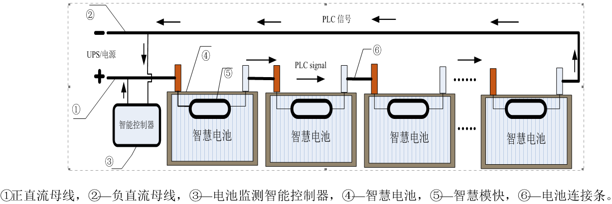 不增加任何测试线,完全不改变电池传统的连接方式及使用方式,每一节智慧电池通过其他智慧电池、智慧电池间的连接线、正直流母线和负直流母线,将检测到的电池本体的多维性能参数以及该智慧电池的ID信息以电力线载波通信方式发送给电池监测数据接收设备,实现了电池状态信息互联,云平台的蓄电池管理技术,使得所有变电站电池能集中信息管理,使用者及管理者可以随时掌握每一电池当前的多维状态数据,并给出诊断报告,进行均衡维护,提高了变电站直流供电系统电池维护的信息化智能化,有利于蓄电池的使用寿命延长,提高了变电站蓄电池全生命周期的监控管理的效率,具有一定的经济意义以及环保意义。