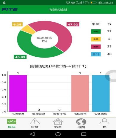 云平台应用保障了智慧电池全寿命周期管理,从智慧电池初始安装使用到报废回收整个生命周期精细化监测管理以及维护策略,最大程度延长电池使用寿命,提高使用效率,从蓄电池用户企业来说,节约成本,实现节能环保,具有极大的社会经济效益。只需提供用户名跟密码,用户就可以在PC机终端应用软件,查看电池监测,分析信息,下载电池诊断报告以及处理结论。另一方面,通过移动网接入,在移动手持设备下载电池管理系统APP应用,实现了随时随地查看电池监测信息的功能。如图3所示为PC机应用软件,如图4所示,为手机终端APP应用软件。