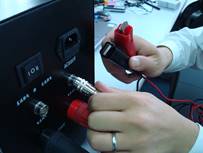 首先连接电池组放电电缆。黑色放电电缆大测试夹一端连接电池组负极,另一端快接插头连接智能放电监测仪黑色快接插座。红色放电电缆大测试夹一端连接电池组正极,另一端快接插头连接智能放电监测仪红色快接插座。注意连接可靠,不要有松动现象。快接接头与快接插座连接好后,需要顺时针方向旋转以防脱落!放电结束取下时逆时针旋转。
